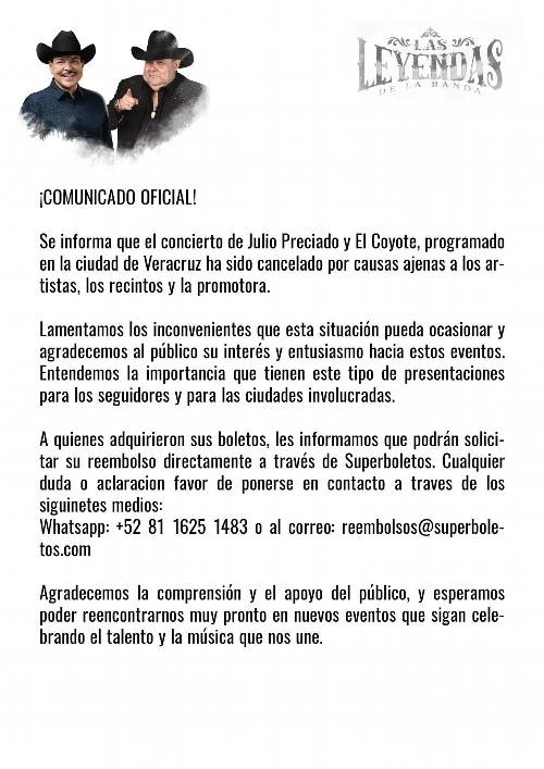 A través de un comunicado, se dio a conocer que el concierto de Julio Preciado & El Coyote programado en el puerto de Veracruz, ha sido cancelado.