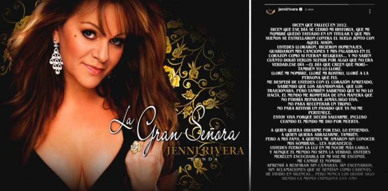 Este rumor ha cobrado más fuerzas las últimas horas, luego que se publicó un inquietante texto a través de las historias de Instagram de la cuenta oficial de Jenni Rivera, en la que asegura sigue viva, sin embargo, dicha historia fue eliminada.