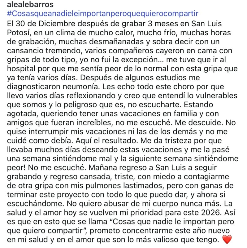 En la publicación subida a sus redes este sábado 3 de enero, indicó: “Mañana regreso a San Luis a seguir grabando y regreso cansada, triste, con miedo a contagiarme de otra gripa con mis pulmones lastimados, pero con ganas de terminar este proyecto con todo lo que puedo dar".