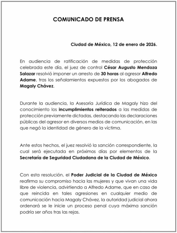 "El juez de control César Augusto Mendoza Salazar resolvió imponer un arresto de 30 horas al agresor Alfredo Adame tras los señalamientos expuestos por los abogados de Magaly Chávez”, se lee al inicio del comunicado.