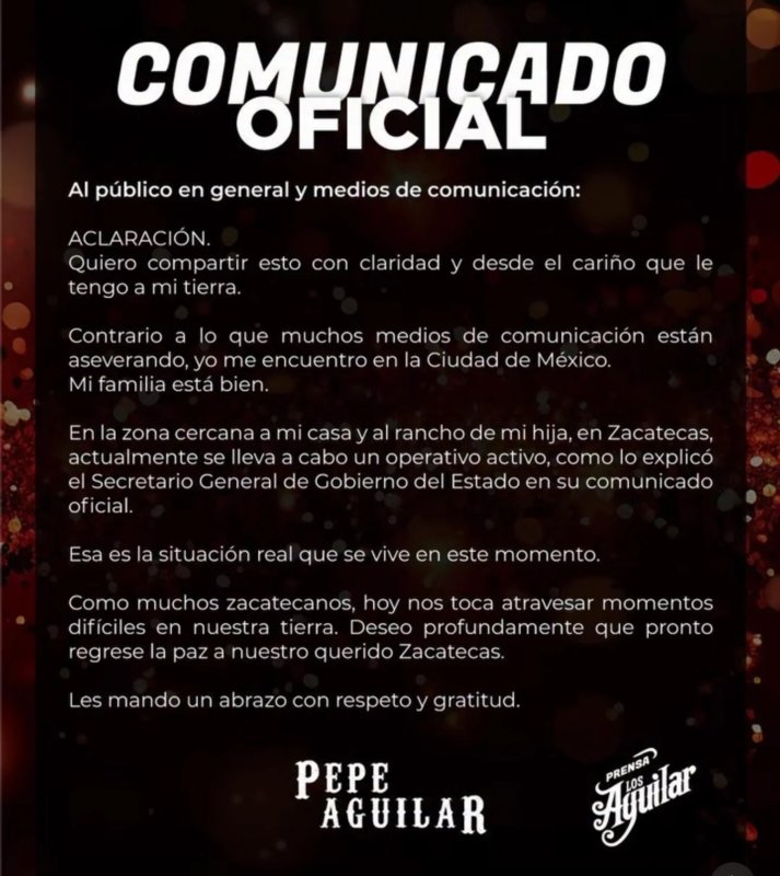 El cantante Pepe Aguilar informó que se encontraba en la Ciudad de México y que el ataque armado ocurrió cerca de su casa y un rancho propiedad de su hija, por lo que tanto él como su familia se encuentran bien.