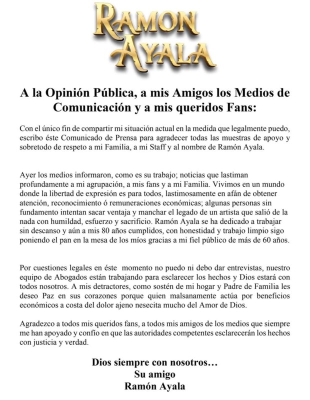 De acuerdo con la defensa, el hombre que conserva su anonimato fue víctima de abusos sexuales cuando iban a bordo de un autobús durante un tour en el que trabajaba para el músico como “personal de apoyo” encargado de las fotografías y videos de los conciertos. Además, señaló directamente al hijo de Ramón Ayala por agresiones físicas en su contra.