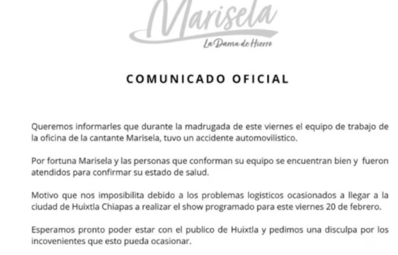 La cantante Marisela, conocida como La Dama de Hierro, sufrió un accidente automovilístico durante la madrugada del viernes 20 de febrero de 2026 cuando se dirigía al municipio de Huixtla, en el estado de Chiapas, para presentarse en la Feria Huixtla 2026, confirmó su equipo de trabajo mediante un comunicado oficial.