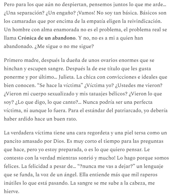 Primero madre, después la dueña de unos ovarios enormes que se hinchan y escupen sangre. “Se hace la víctima” ¿Víctima yo? ¿Ustedes me vieron? ¿Vieron mi cuerpo sexualizado y mis tatuajes bélicos? ¿Vieron lo que soy? ¿Lo que digo, lo que canto?… Nunca podría ser una perfecta víctima, ni aunque lo fuera. Para el estándar del patriarcado, yo debería haber ardido hace un buen rato.