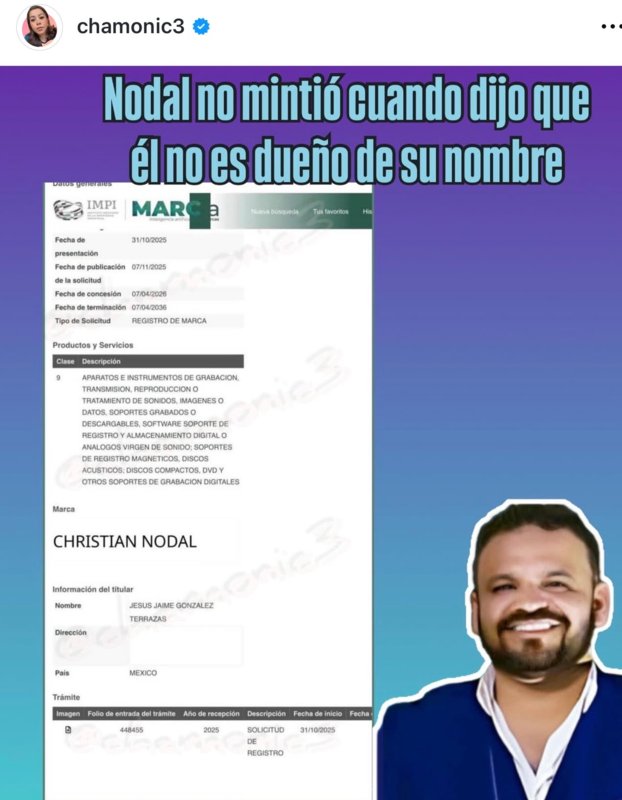 Ahora, de acuerdo con información de las creadoras de contenido Adri Toval y Chamonic, el registro de la marca “Nodal” está a nombre del padre del artista, Jesús Jaime González Terrazas.